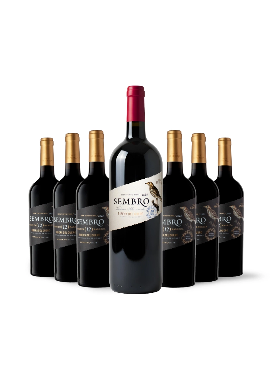 Sembro Edición Limitada 2022 y Sembro 2023 Magnum comparten el alma del Tinto Fino de Ribera del Duero, pero cada uno revela una cara distinta de su carácter. La E.L. 2022 nace de una selección minuciosa de viñedos viejos —más de 30 años— en zonas altas y de suelos calizos y pobres de Pesquera de Duero, Quintana del Pidio y Gumiel del Mercado. Tras más de 12 meses en barrica nueva de roble francés y un reposo prolongado en botella, expresa la profundidad y la elegancia del vino de guarda.
